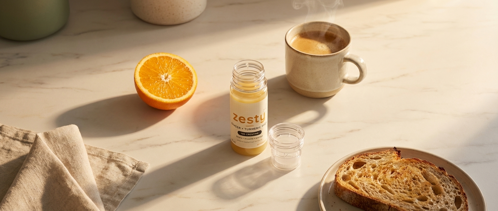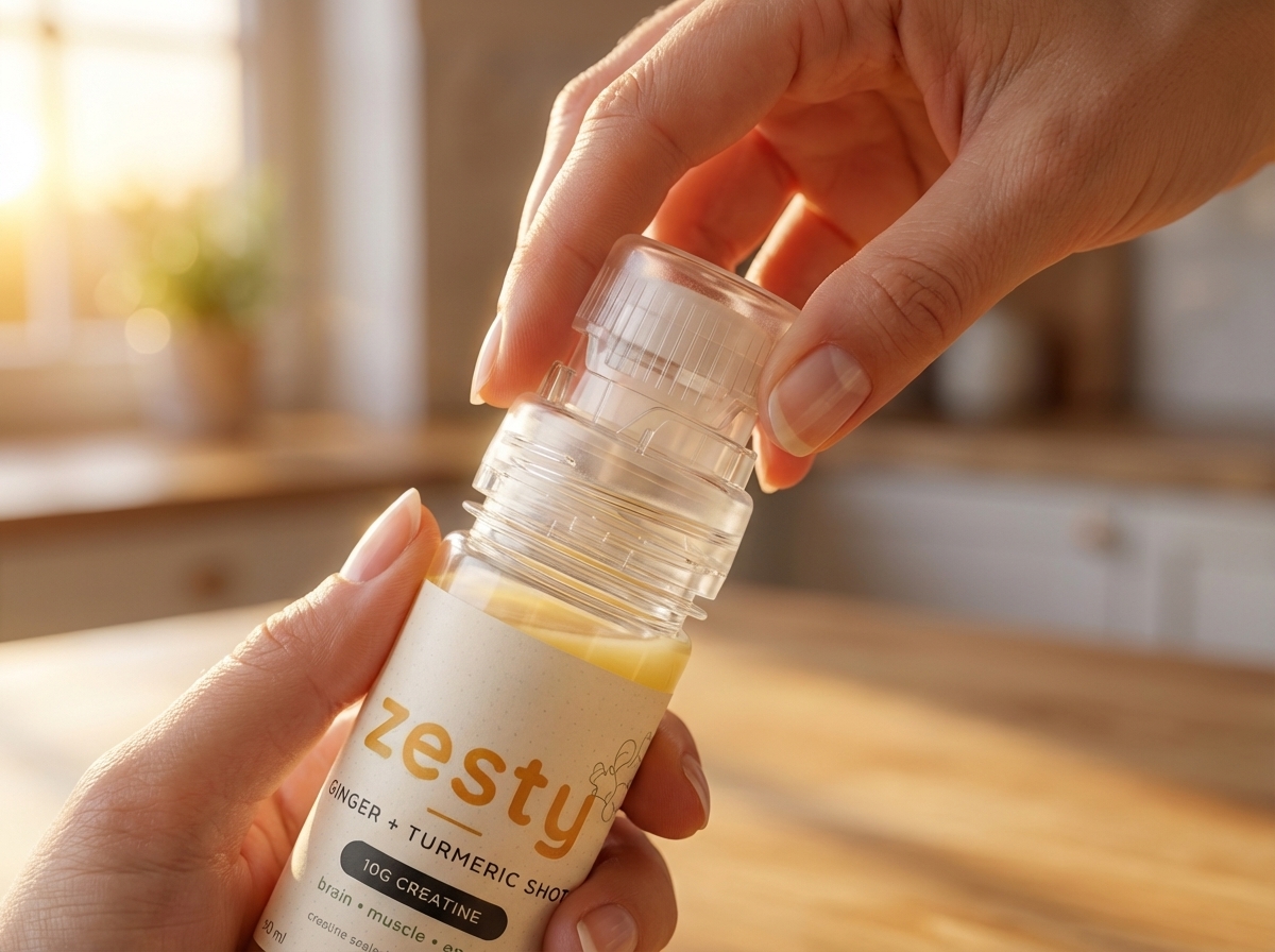 A tub gives you powder and a scoop. zesty gives you 10g sealed dry in the cap, a cold-pressed shot with piperine for absorption, and electrolytes for uptake. Plus ginger and turmeric that target menopause inflammation. No mixing, no measuring.